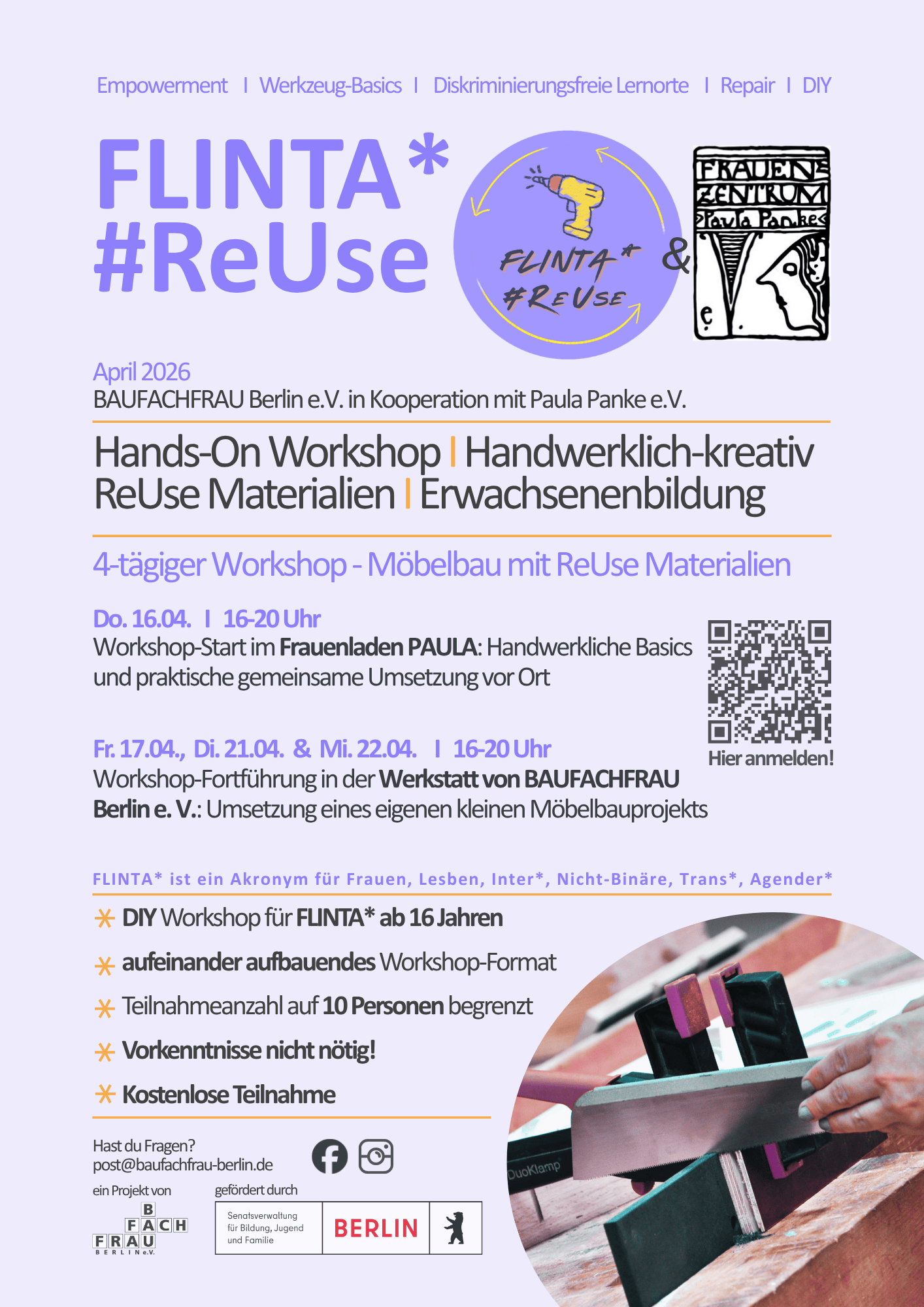Das Projekt wird von BAUFACHFRAU Berlin e.V. in Kooperation mit PAULA PANKE e. V. – Frauenladen Paula durchgeführt.
