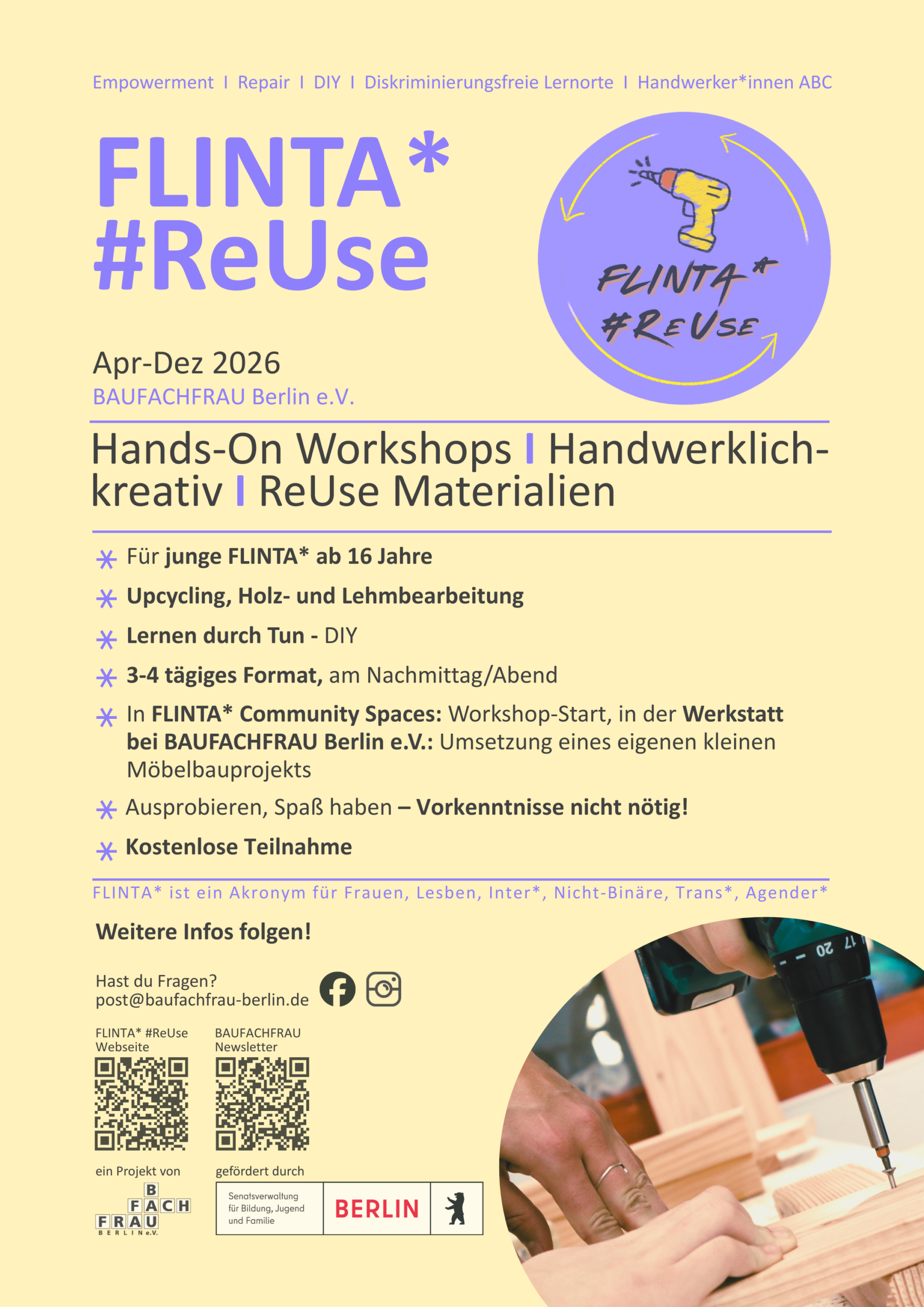 Hast du Interesse, mit uns als FLINTA* Community-Space zu kooperieren? Schreib uns gerne an post@baufachfrau-berlin.de.
